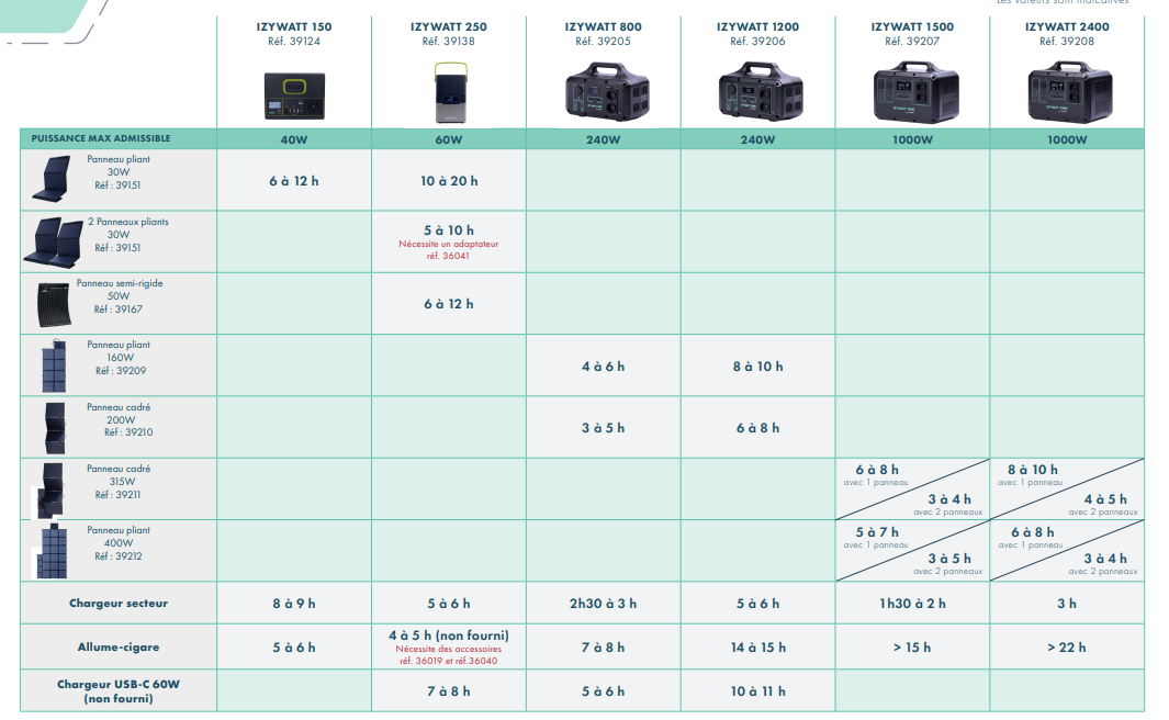 | Izywatt 250 | 243 | 300 | 1 | 1 | 1 | 2 (5V) | 1 | 1 | Camping, pèche |