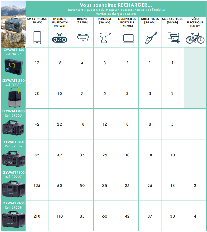 Orium facilite le choix de batterie grâce au tableau ci-contre dans lequel vous retrouverez les différentes stations d’énergie portatives IZYWATT et des exemples d’appareils à charger ou à alimenter en direct.
