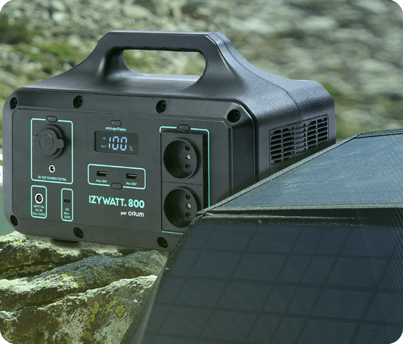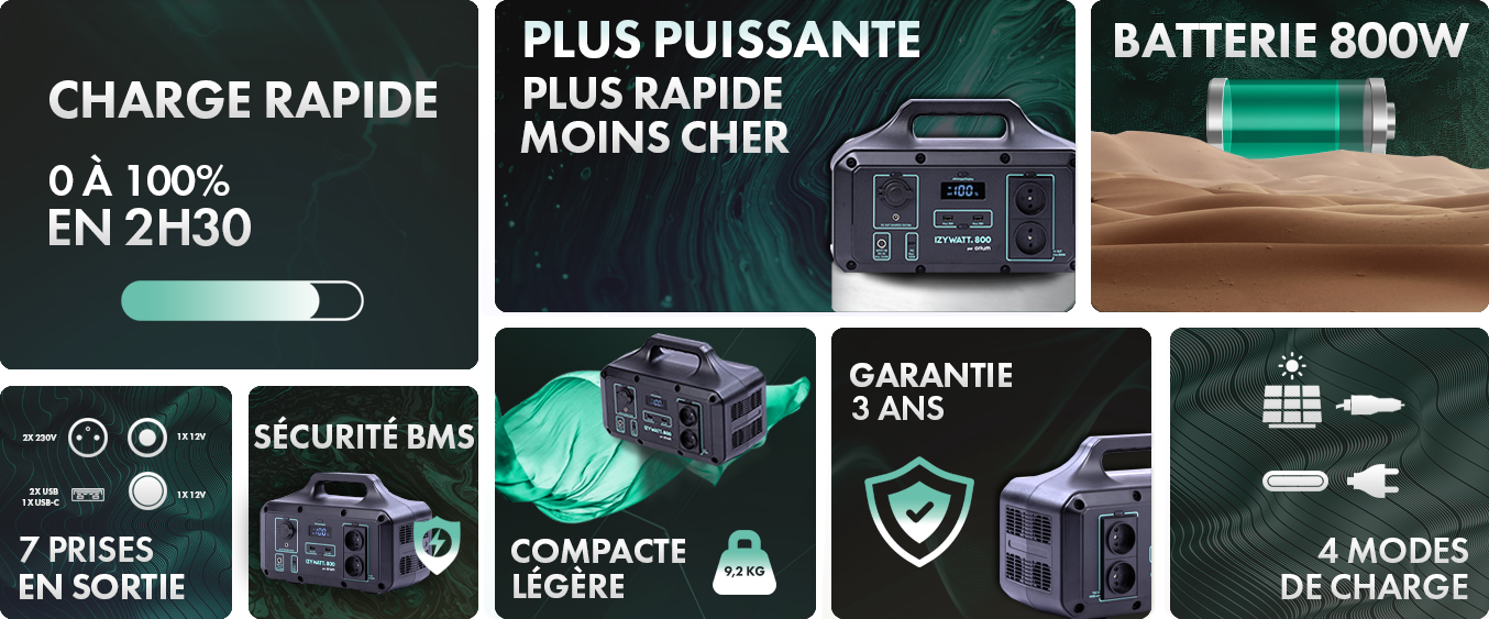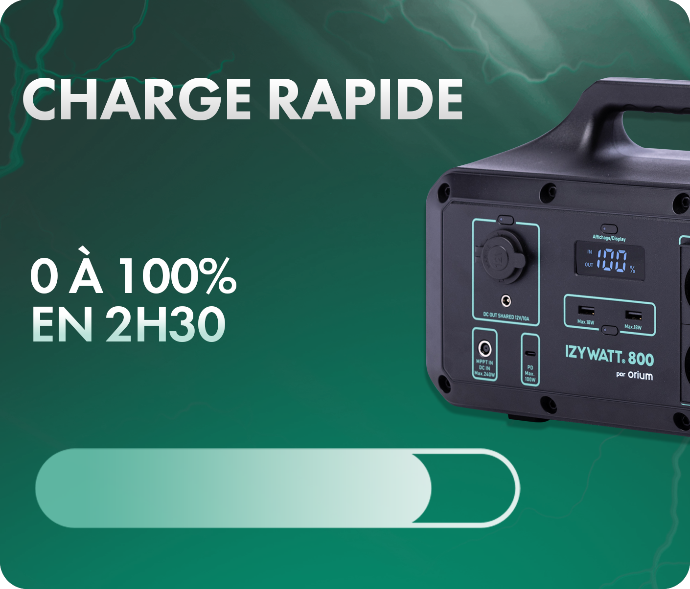 - 4 modes de charge : secteur (2h30), voiture 12V (7 h), solaire 160W (4h), USB-C (5 h)