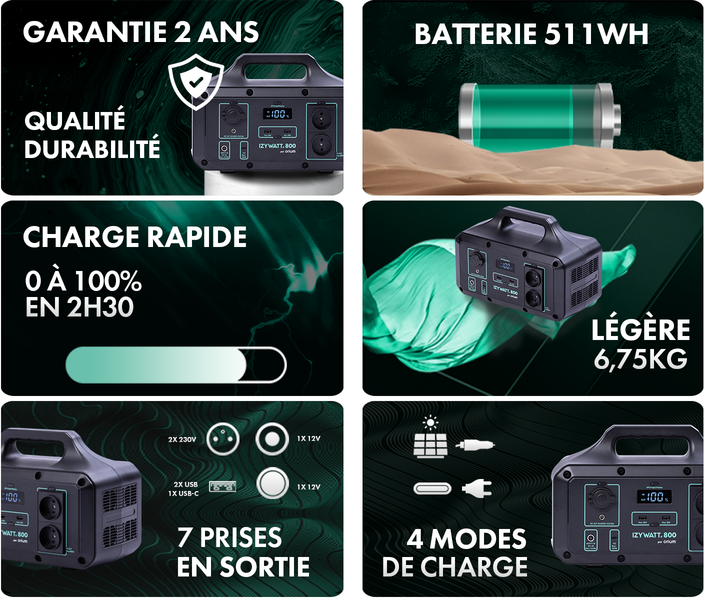 - Capacité : 511 Wh et puissance de sortie de 800W