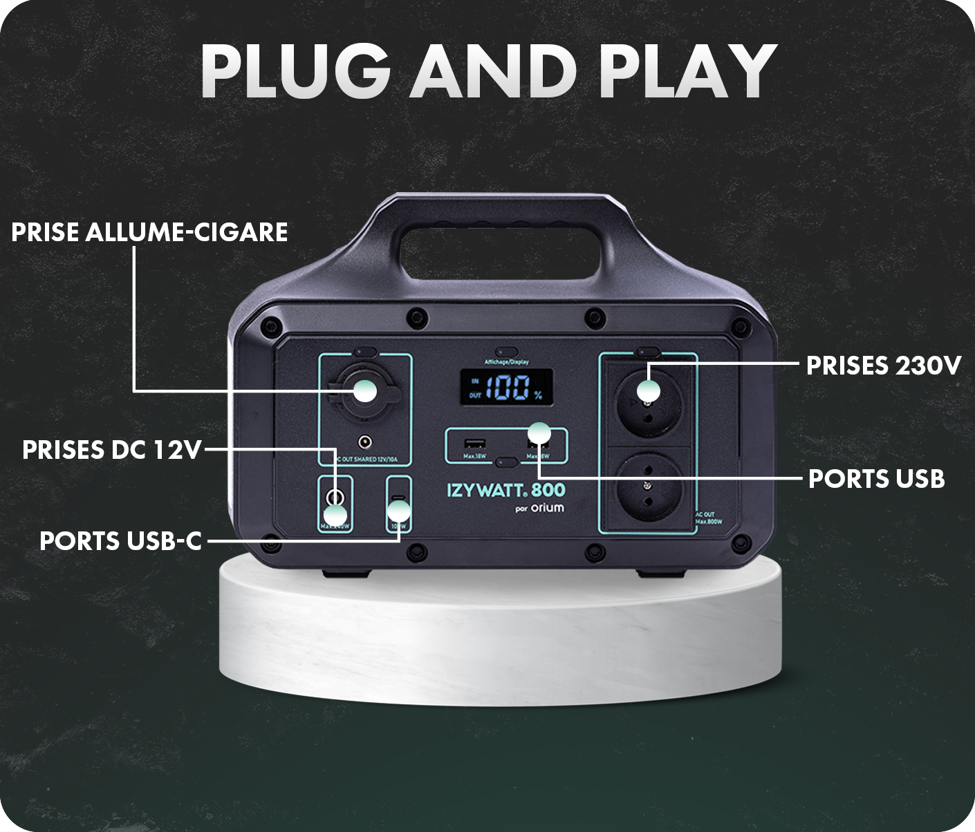 - 7 prises : (2 prises secteur, 2 prises USB, 1 prise allume-cigare, 2 prises DC)
