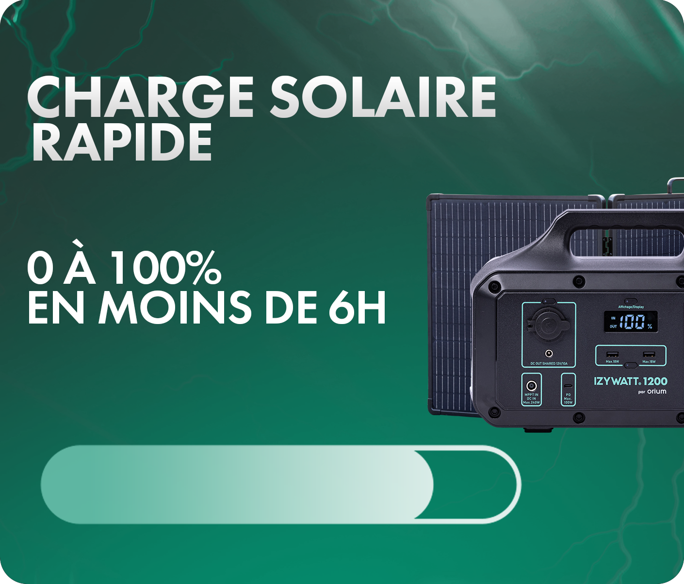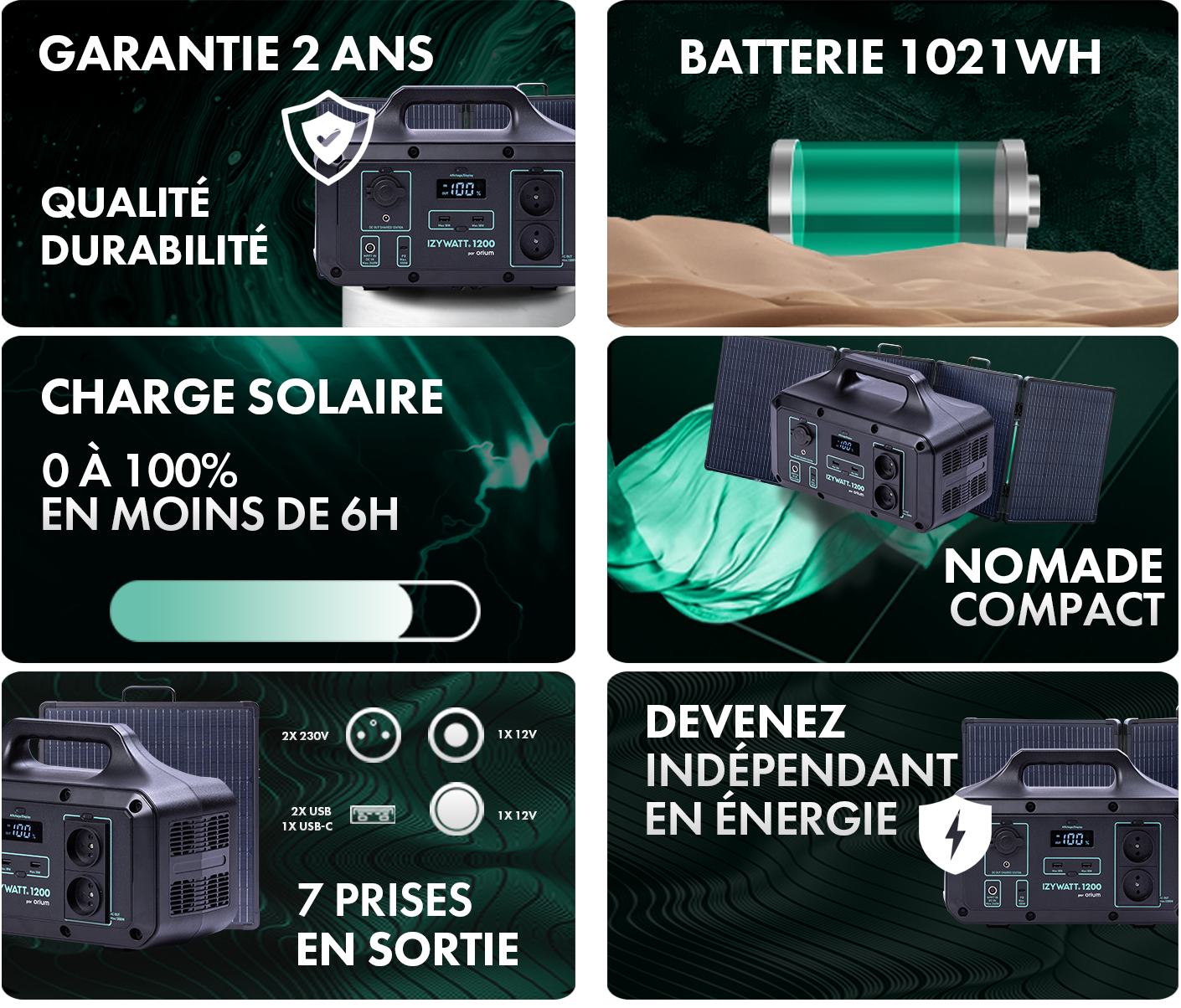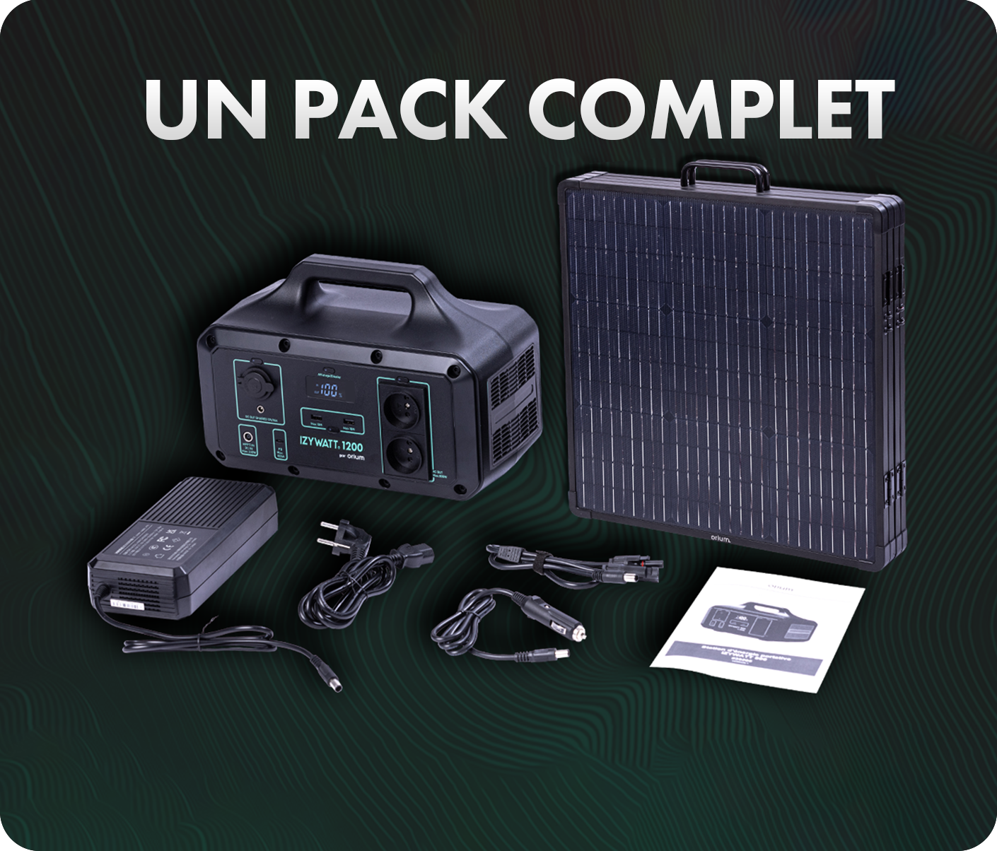 - Composition du pack : batterie IZYWATT 1200, panneau solaire 200W et accessoires