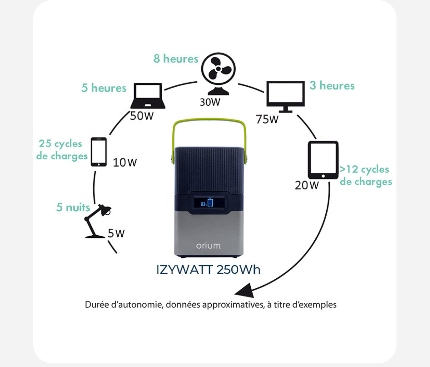 - Exemples d’usages : 25 téléphones, 5 heures de PC, 3 heures de TV, 12 tablettes ...