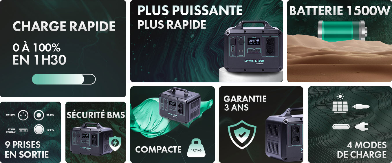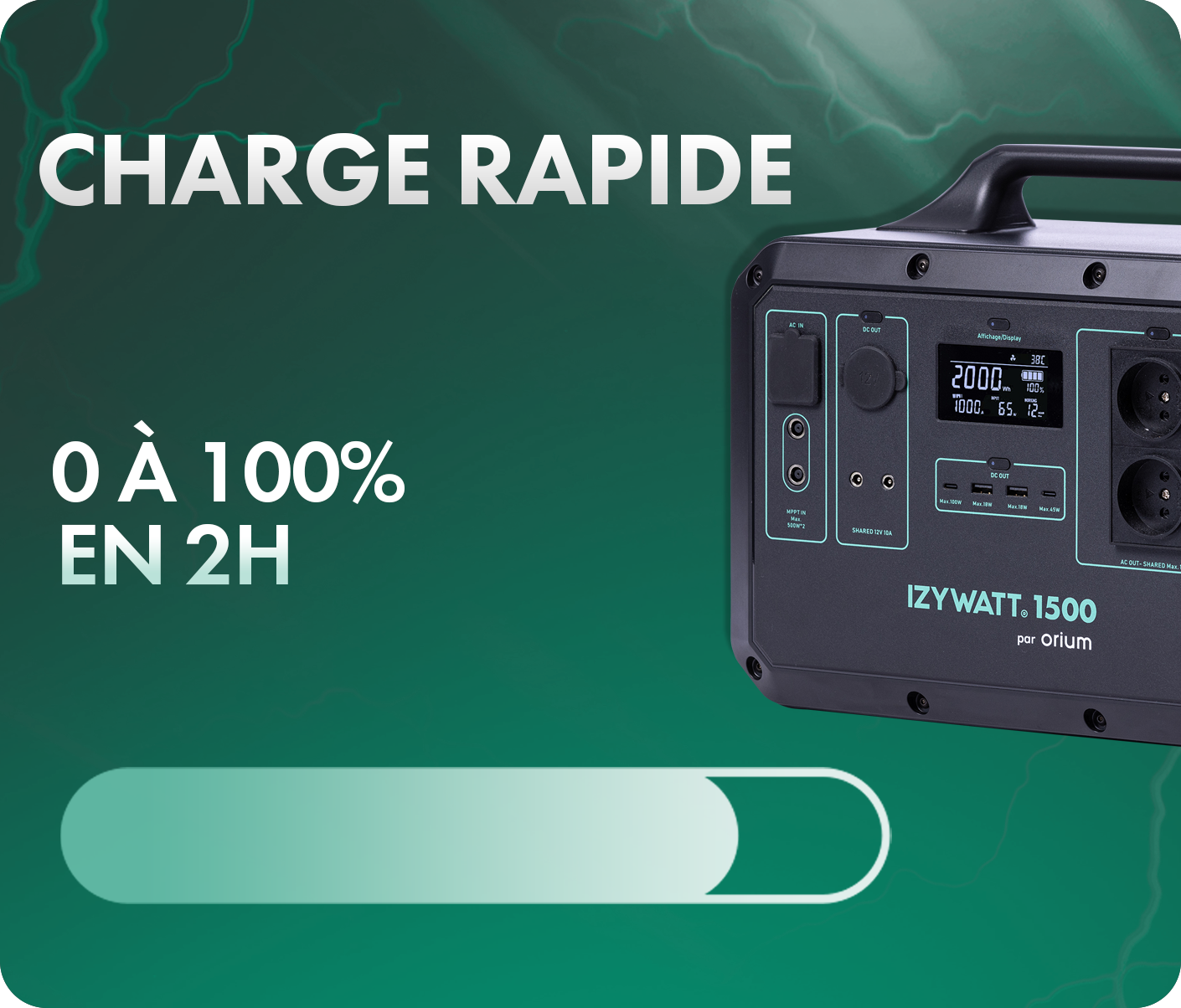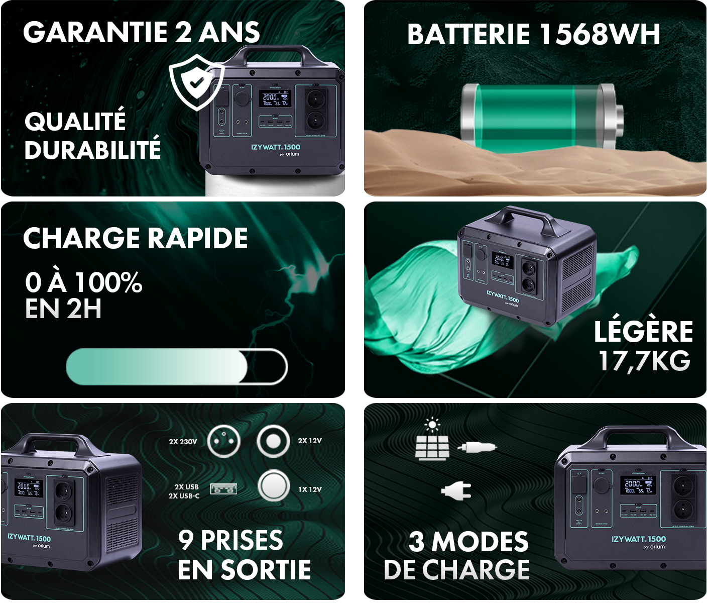 - 3 modes de charge : secteur 230V (1h30), voiture 12V (15 h), solaire 315W (6h),