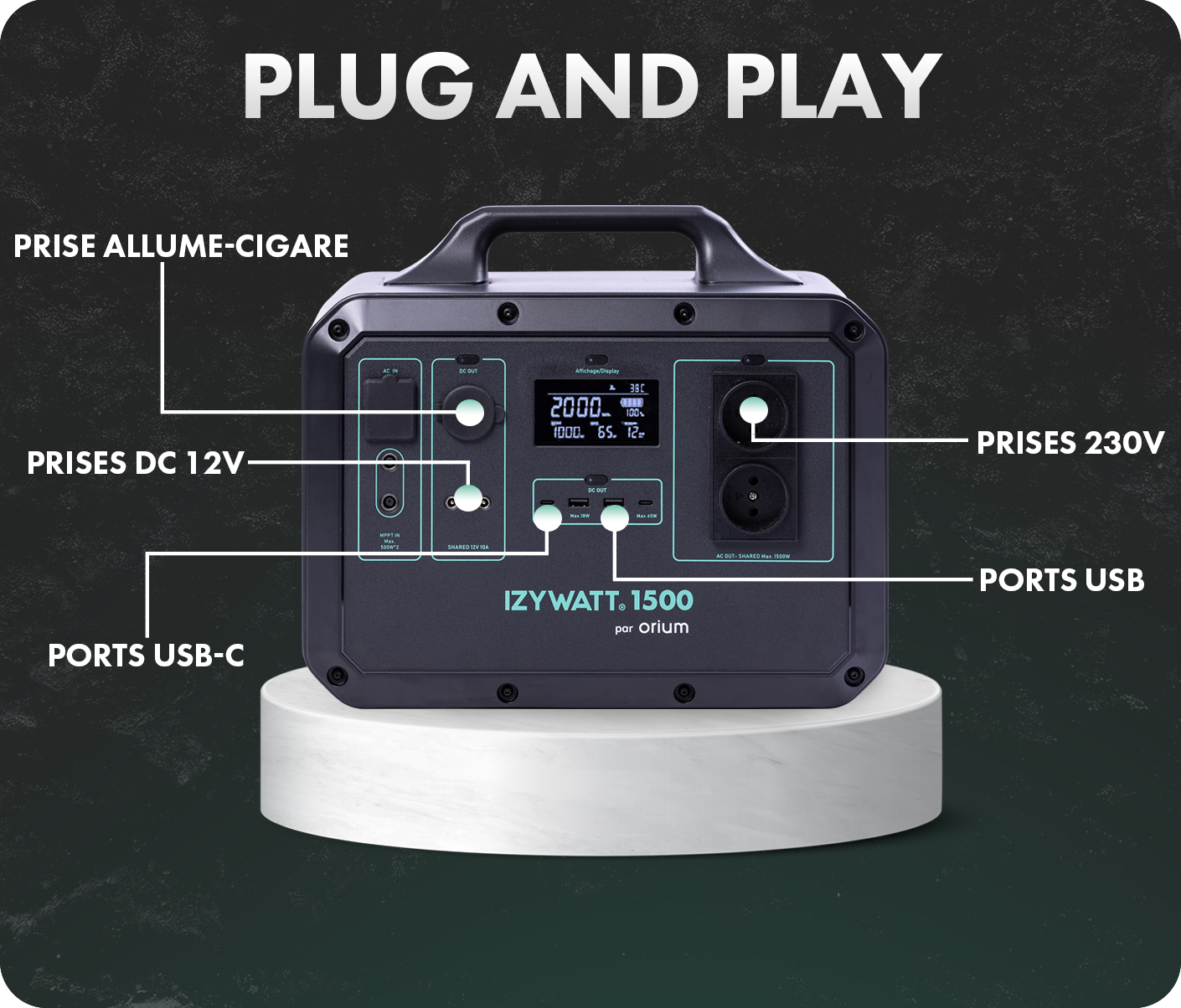 - 9 prises : (2 prises secteur, 4 prises USB, 1 prise allume-cigare, 2 prises DC)