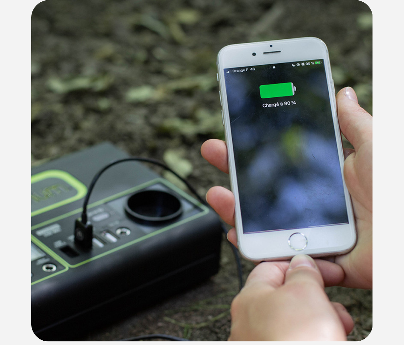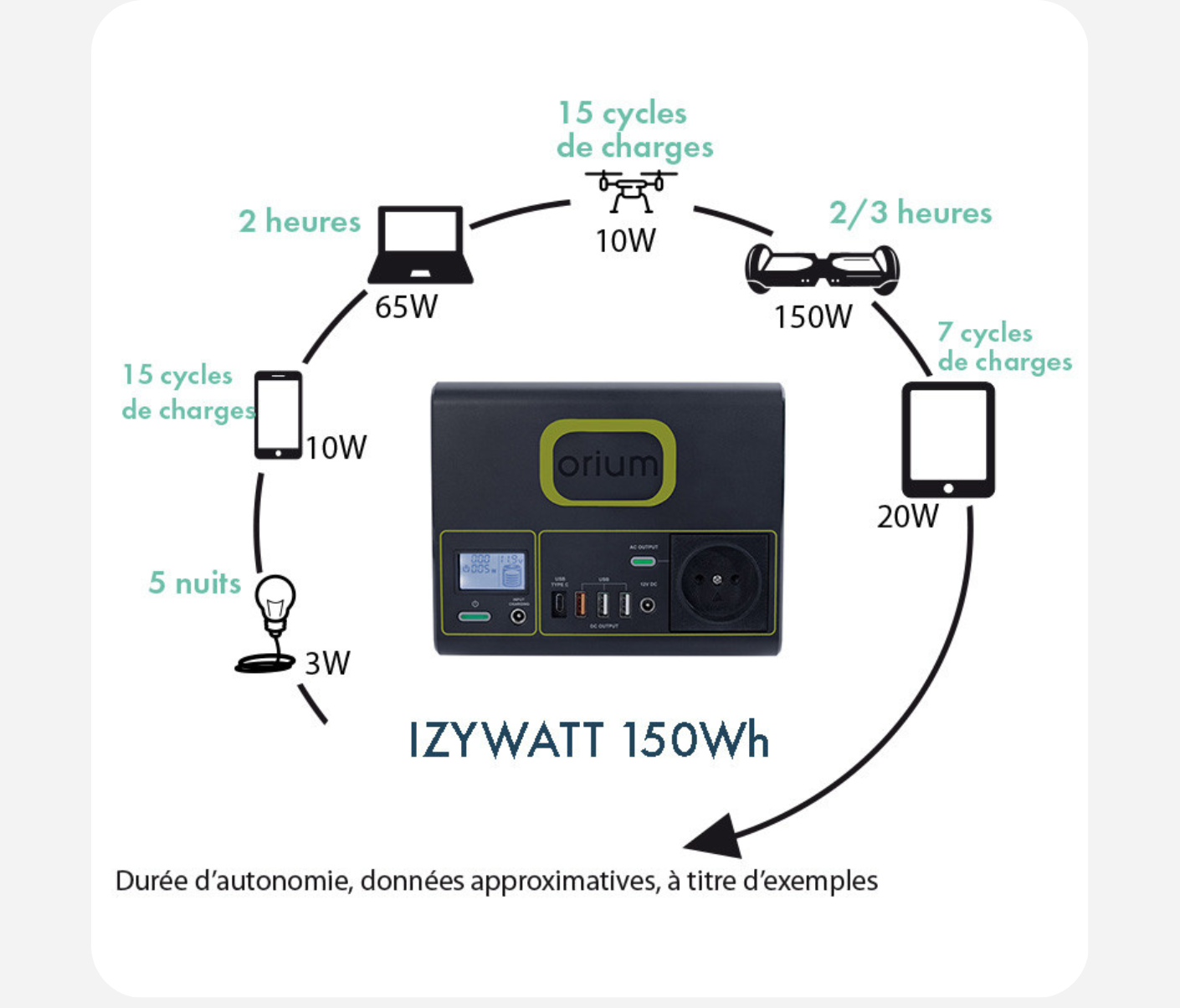 - Exemples d’usages : 15 téléphones, 2 heures de PC, 15 drones, 7 enceintes ...