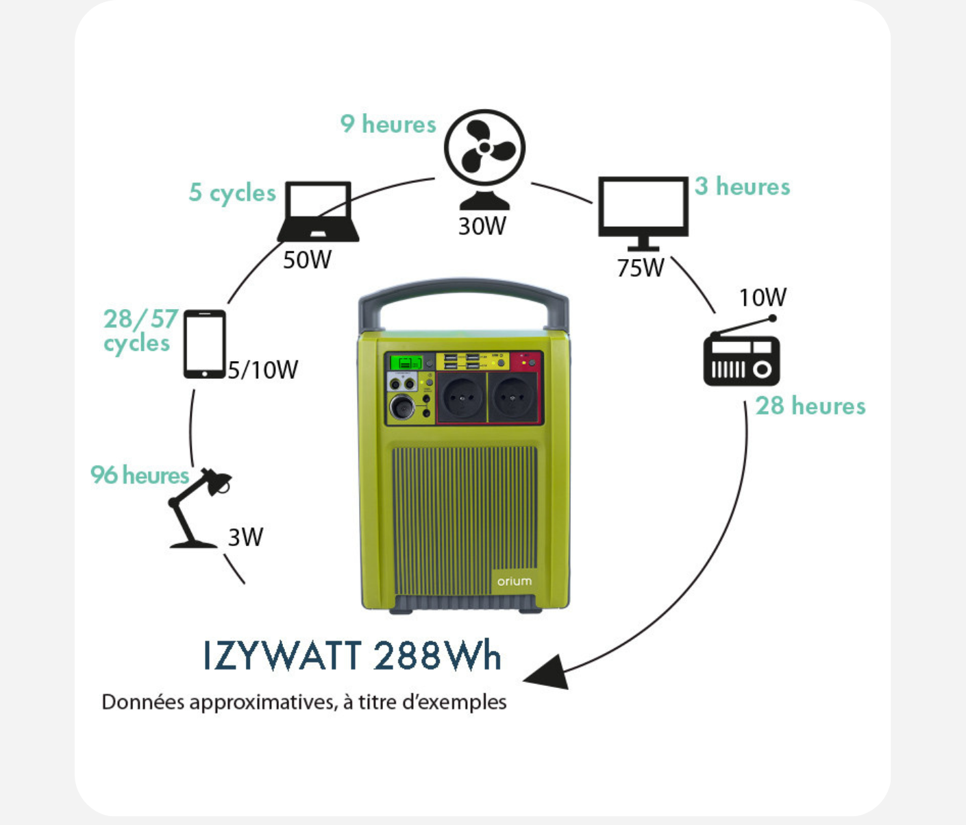 - Exemples d’usages : 35 téléphones, 5 PC, 3 heures de TV, 28 heures de radio ...