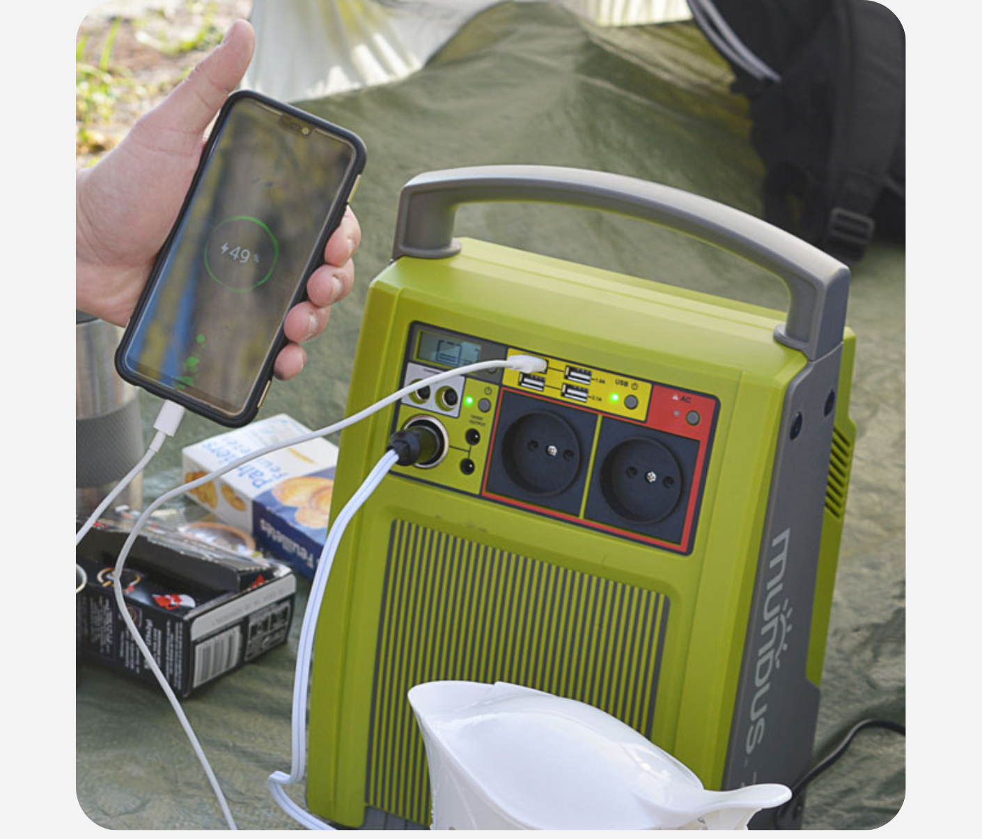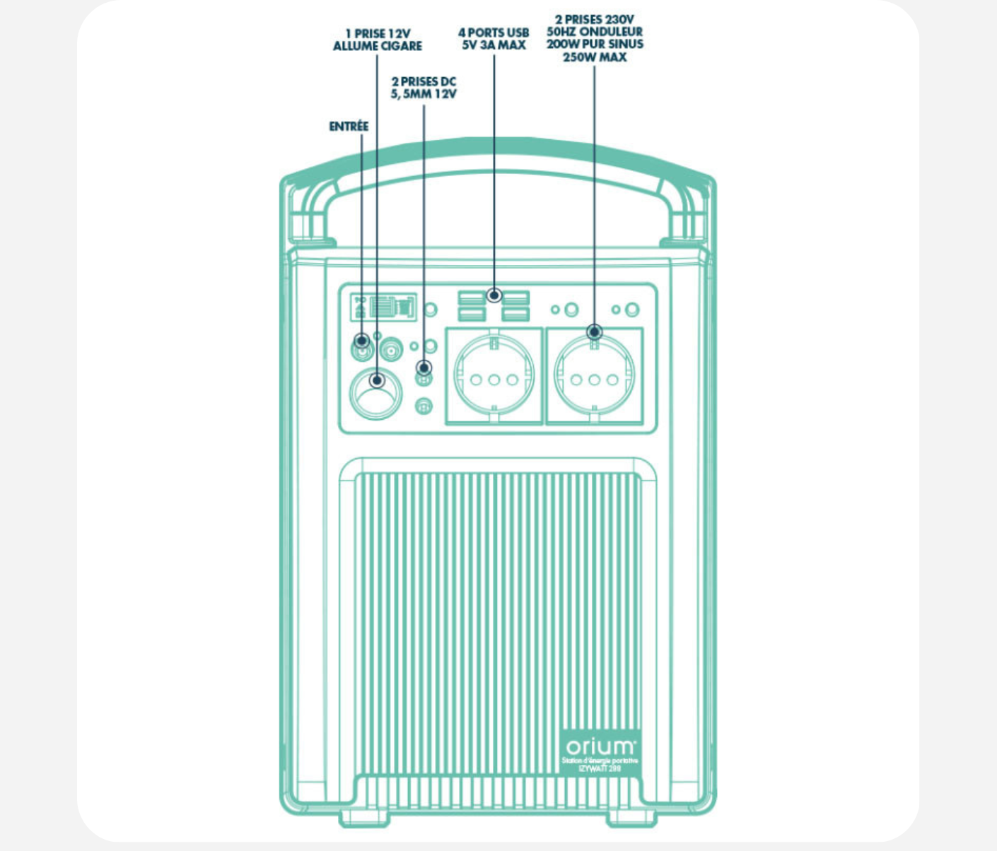 - 9 prises (2 prises secteur, 4 prises USB, 2 prises DC, 1 prise allume-cigare)